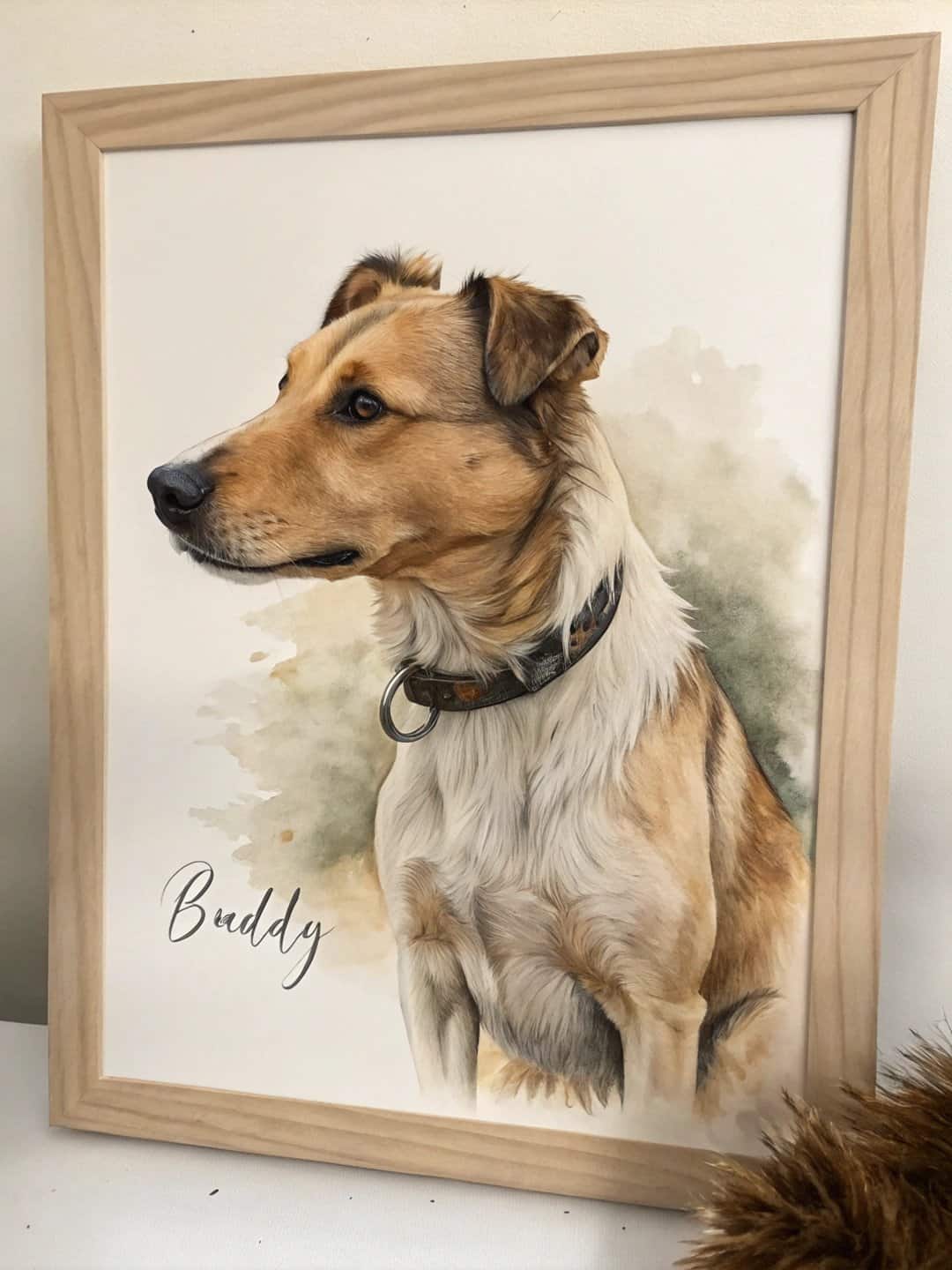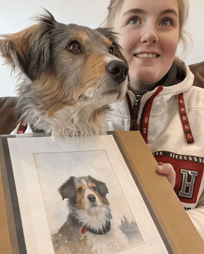 "I’m so happy with how this turned out! I tried getting a portrait of my dog from another place before, but the result was disappointing. When I ordered from here, they actually nailed it – you can see the texture of my dog’s fur so clearly! The wait was a bit longer than I expected, but totally worth it. The quality is amazing, and it looks perfect in our living room. So glad I went with this!"
