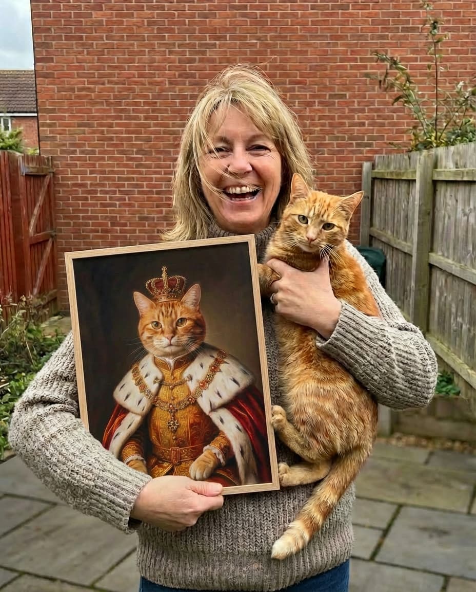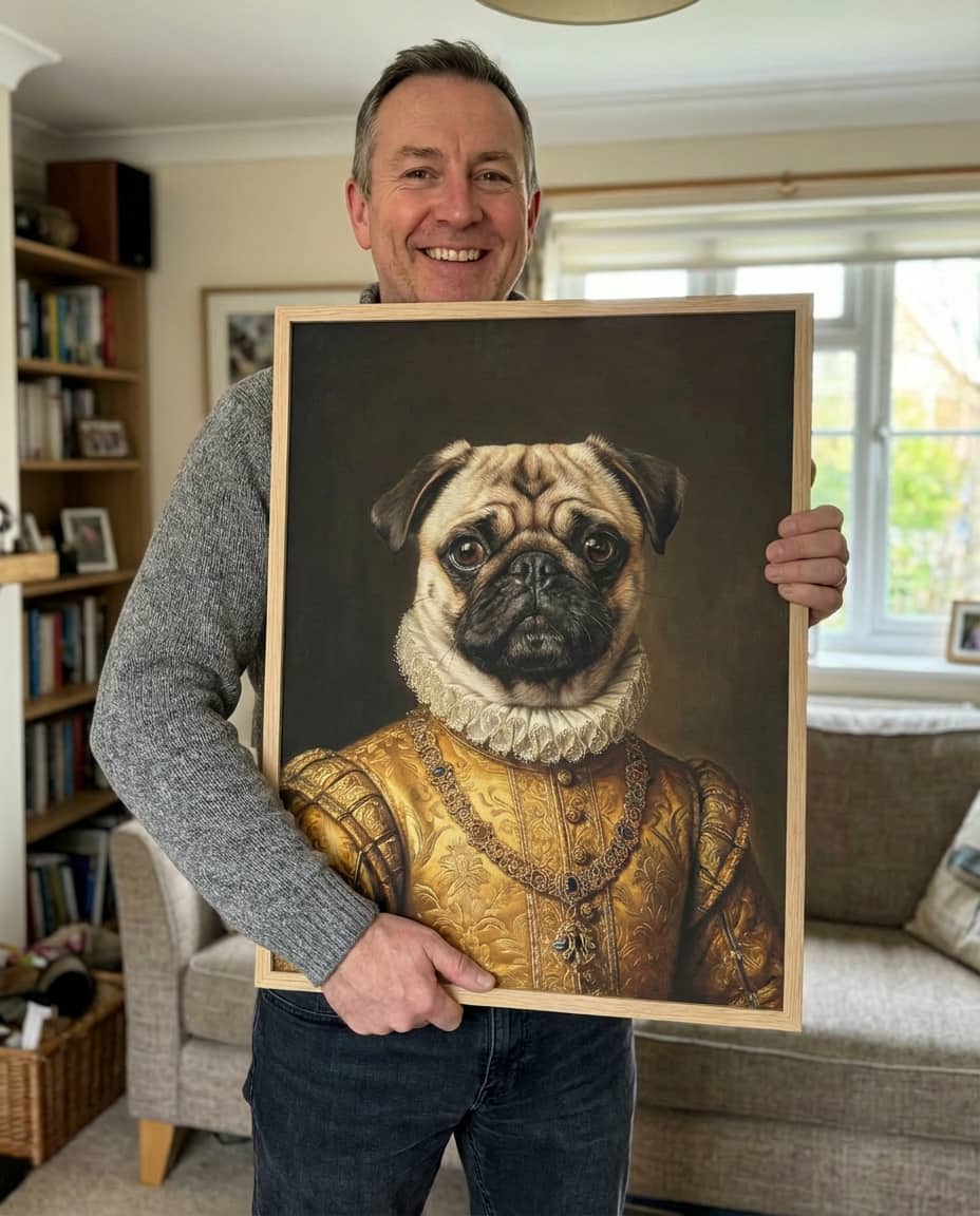 I ordered the 'Royal King' lenticular portrait because, let’s be honest, Barnaby already acts like he rules the house. The quality is just brilliant. It’s not just a static picture; the way it shifts is mesmerizing. One moment he looks like his usual cheeky self, and as you walk past the mantelpiece, he seamlessly transforms into this regal monarch in red velvet and a crown. It’s genuinely hilarious and impressive at the same time.